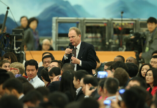 中外记者在总理记者会上举手提问。