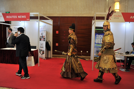 “兵马俑”玩“穿越” 着古装逛亚洲航线大会 。 3月16日,第十三届亚洲航线发展大会现场,来自西安机场的工作人员身着古装佩剑从大会展厅走过,引来许多参展商拍照。15日,第十三届亚洲航线发展大会在昆明举行。