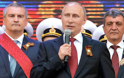 2014年5月9日,在俄羅斯黑海艦隊駐紮地塞瓦斯托波爾,俄羅斯總統普京(中)發表講話。俄羅斯黑海艦隊駐紮地塞瓦斯托波爾9日舉行閱兵式,紀念衛國戰爭勝利69周年和塞瓦斯托波爾從德國法西斯手中解放70周年。俄總統普京當天在觀摩了莫斯科紅場勝利日閱兵式後前往塞瓦斯托波爾,出席當地舉行的上述紀念活動。新華社/法新