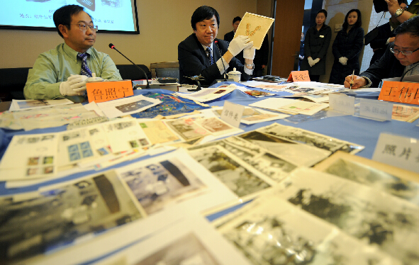 当天在纪念馆,自千万公里外、跨海而来的120件“无言史证”铺满会议桌,有书籍、杂志、报纸、图片、地图、邮票、明信片、信封、纱巾、胶片、模型等。