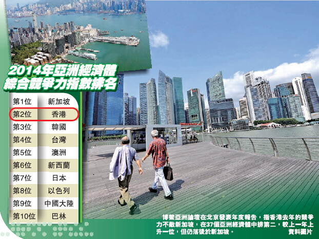 博鰲亞洲論壇昨天發表年度報告指出,2014年香港在亞洲經濟體綜合競爭力排名較去年躍居一位,排名第二。根據這一報告,2014年亞洲經濟體綜合競爭力指數前10名依序為新加坡、香港、韓國、台灣、澳洲、新西蘭、日本、以色列、中國大陸、巴林。整體而言,2014年前10名與2013年差距不大。