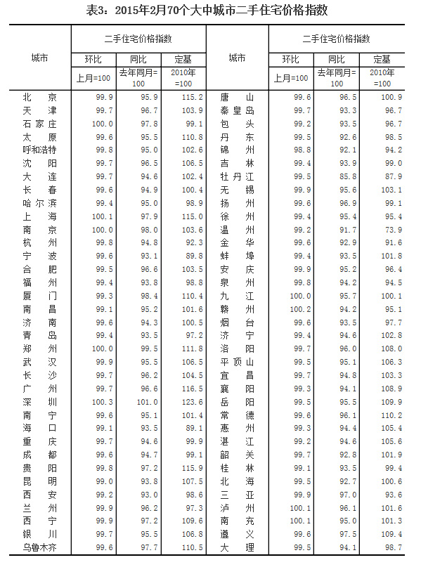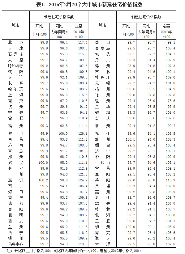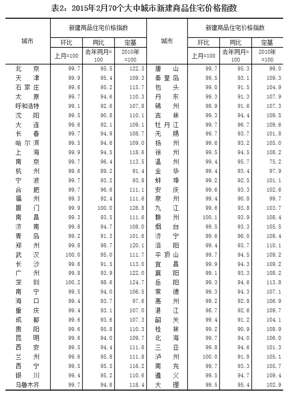 中國經濟網北京3月18日訊(記者 李方) 國家統計局今日發布2015年2月份70個大中城市住宅銷售價格變動情況,與1月相比,70個大中城市中價格下降的城市有66個,上漲的城市有2個;與去年同月相比,價格下降的城市有69個,持平的城市有1個。