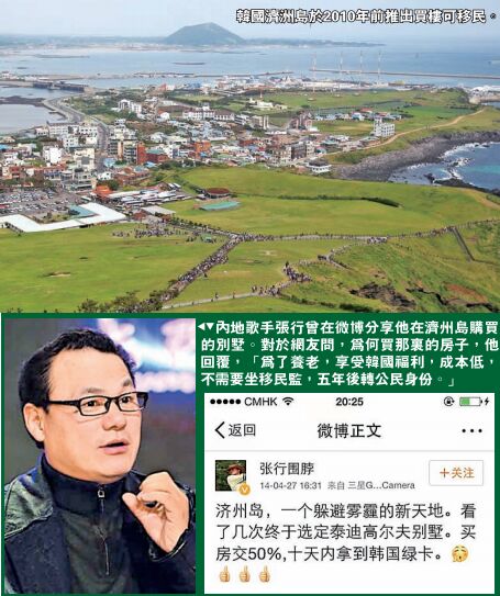 內地歌手張行去年在微博上曬出了他在濟州島購買的別墅,并透露總價為人民幣630萬元,每平米價格為35000元。有網友問,為何買那里的房子?他回覆了五大理由,「為了養老,享受韓國福利,成本低,不需要坐移民監,五年后轉公民身份。」