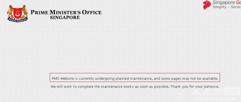 這是事發時小編到新加坡總理公署查證時的頁面,網站維護中,并未發布“李光耀病逝”的消息。