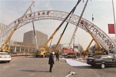 天津機場片區中心大道拱形標識、天津港片區南北卡口標識、中心商務區天津大道拱形標識均已完工。天津自貿區組織架構方案明確,在天津機場片區、天津港片區、濱海新區中心商務區分別設立行政許可服務大廳。目前,三個片區的行政許可服務大廳新建改造工作已經完成,其中中心商務片區已投入試運營。