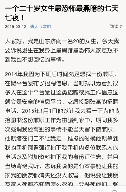 小孙(化名),一个二十岁的济南女子,被一大学老师张某以招聘兼职为名骗至家中,遭非法拘禁七天七夜。在这黑暗的七天里,张某实施了多次强奸,并把刀架在女子脖,以死亡相威胁,并强行拍下了她的裸照。视频是济南电视台都市新女报对此案的报道,下图则是女孩对这一事件的描述。
