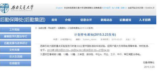 據西南交通大學后勤保障處發布的停電通知,因牽引動力國家重點實驗室進行時速500公里中國標準動車組試驗,經用戶超大負荷用電保障申請,學校批準,定于:2015年3月25日23:55—26日04:00;3月26日23:55—27日04:00;九里校區眷誠齋12幢、13幢,15幢、三食堂、游泳池、中達A、齊達、工行、中行、等區域配合停電。