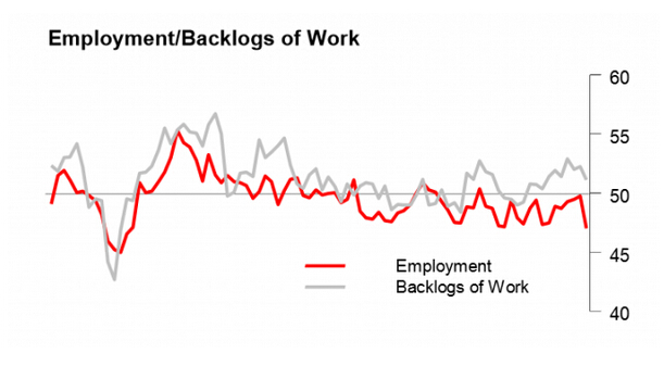 分項數據中,3月制造業PMI產出指數為50.8,創2個月新低,低于2月的51.7。新訂單指數跌至49.3,同樣為11個月新低。新出口訂單指數連續第二個月下滑,但跌速減緩。就業指數跌幅較大,為連續第17個月低于50,并創下2009年2月以來低點: