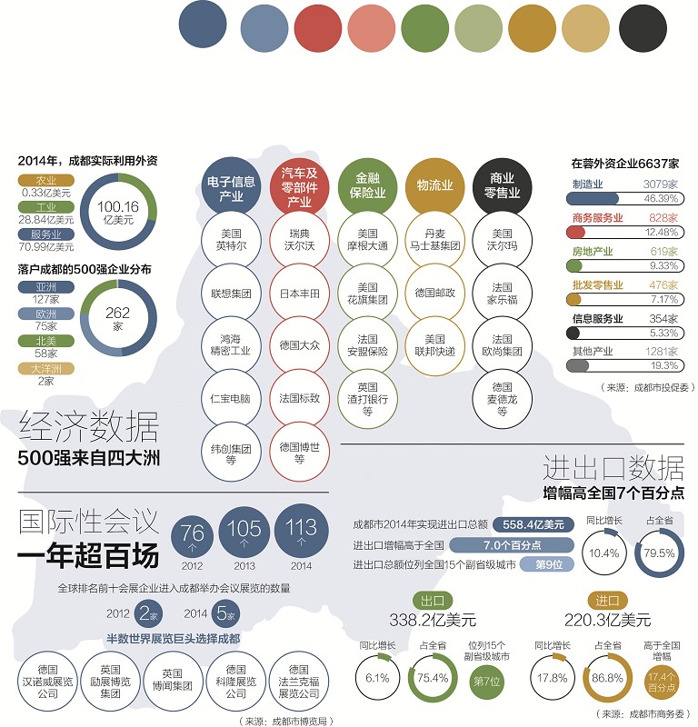 成都同樣也是全球資本追逐的寵兒。截至2014年底,落戶成都的世界500強企業達到了262家,位居中西部第一名,實際利用外資100.16億美元,繼續保持高位運行。有了這些企業和外來投資,成都與世界的聯系正越發緊密。