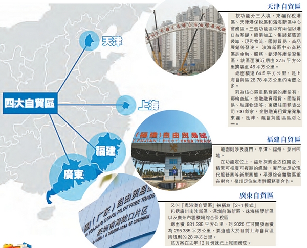 廣東、天津、福建三大自貿區的獲批,亦給上海自貿區帶來了新的挑戰。上海自貿區擴區計畫於去年12月獲得國務院批復。根據批復,上海自貿區從原來的28.78平方公里,擴展至120.72平方公里,覆蓋範圍擴至陸家嘴、張江和金橋地區。