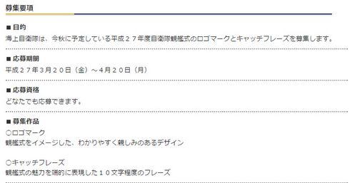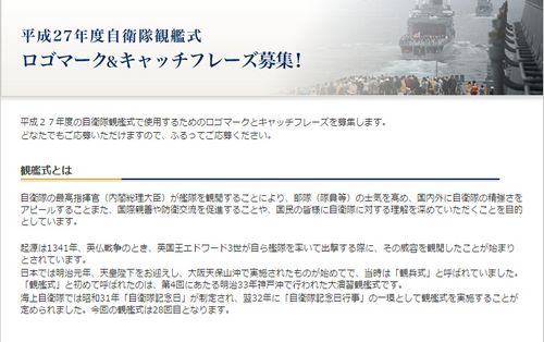3月24日,日本海上自衛隊官方網站發布消息稱,2015年秋季日本將舉行海上自衛隊閱艦式,旨在提升自衛隊隊員士氣、展示自衛隊精銳武器,同時展現自衛隊國際親善形象、促進與各國防務交流,加深國民對日本自衛隊的理解,日本自衛隊最高指揮官(內閣總理大臣)將親自檢閱海上自衛隊。目前,日本海上自衛隊公開向日本民眾征集閱艦式標語和圖標,募集時間3月20日至4月20日。