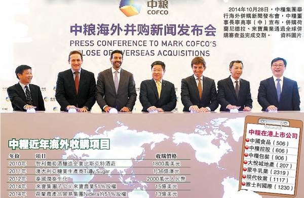 實際上,近年國際農產品市場大幅波動,中資「走出去」收購糧食相關資產的步伐加快,計及中糧兩宗巨大收購,2014年中企在食品及農業領域已完成的併購活動金額達112億美元,為2013年的7倍,佔全球當年農業併購金額的60%左右,創出中國農業併購史最高紀錄。