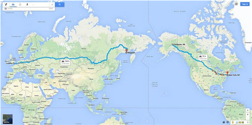 根據Google Map的計算,如果要由倫敦揸車過現行西伯利亞公路終點馬加丹(Magadan),長13146公里,不眠不休24小時行駛,要花159小時,即最少6.6日才到達。