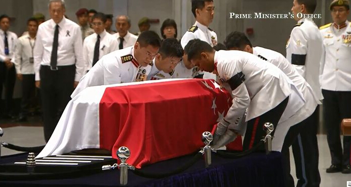 新加坡為已故建國總理李光耀舉行國葬,李光耀長子、現任總理李顯龍先致悼詞,形容父親是戰士,為新加坡人民帶來信心、面向未來,他更以華語說︰「跟著李光耀走,不會死」。