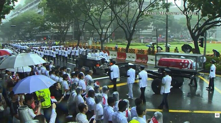 新加坡已故建國總理李光耀國葬儀式下午舉行,靈柩中午由國會大樓出發,移送到新加坡國立大學文化中心。