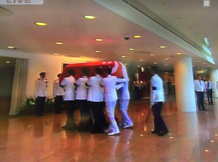 李光耀靈柩蓋上新加坡國旗,再將由八名來自海陸空三軍和警隊的扶靈軍官,移送上拖曳炮架,移送離開國會大樓。