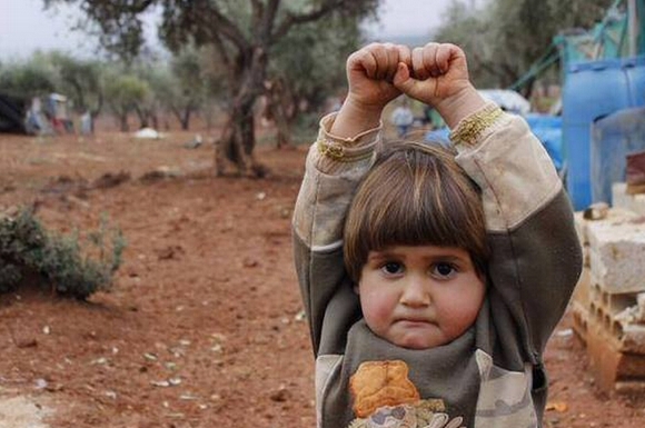 巴勒斯坦攝影記者納迪婭(Nadia Abu Shaban)在推特分享的一幀拍攝於敘利亞的照片。照片中一名小女孩看到納迪婭用攝影鏡頭「瞄準」自己,小女孩誤以為相機就是武器,害怕得立刻高舉雙手投降,圓圓的小臉緊抿著嘴唇,一臉憂戚恐懼讓人心疼。