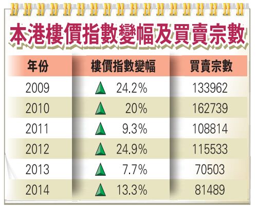 金管局早於2009年10月推出首輪收緊2000萬元或以上的住宅物業按揭措施,按揭成數調低至六成,之后一年樓價仍升20%,樓宇買賣逾16萬宗。但2010年11月政府公布推出額外印花稅(SSD)后,2011年樓價升幅收窄至9.3%,樓宇買賣跌至逾10萬宗。不過,2012年樓價升幅增至近25%,買賣宗數稍回升至逾11萬宗,於是政府在同年10月推出買家印花稅(BSD)及提高SSD稅率和適用期,之后一年2月政府再公布推出雙倍印花稅,同年樓價升幅再調低至7.7%,買賣宗數則首次跌破10萬宗,至7.0503萬宗。到了去年,樓價指數再重回雙位數升幅,樓宇買賣稍回升至8.1489萬宗,但仍低於10萬宗水平。