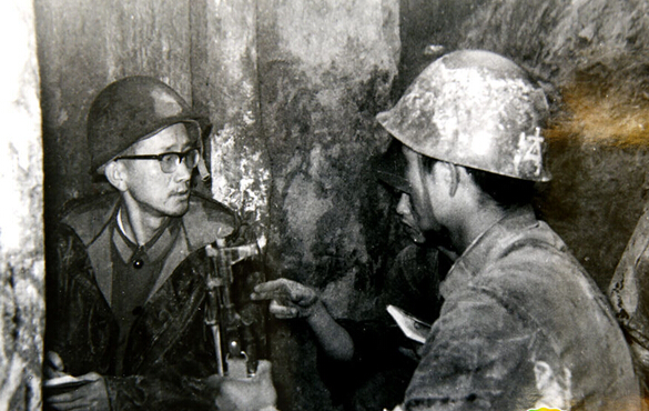 1984年4月28日,中国人民解放军成功占领老山主峰。图为黄宏(左一)在刚刚收复的主峰坑道中与战士交谈。资料图