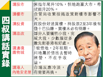 【香港商報网訊】記者周倩穎報道:李兆基(人稱四叔)昨日出席恒基(012)與銀團簽約儀式之后與傳媒見面時表示,金管局收緊按揭政策對樓市影響不大,但政府不想樓市再升,投資樓市不如投資股市,并預測今年年尾恒指會升10%。關於金管局一個月前收緊樓市按揭政策,四叔料對市場影響不大,但一向熱衷買股票的四叔直言不建議大家買樓作為投資,并放豪言:「買股票兩至三年后有幾十巴仙賺;買樓的話,算上稅收、差餉,兩三年未必有得賺。」李兆基更預測,恒指到今年年底會升10%,并稱「恒地肯定跑贏大市;恒指若有10%升,恒地就有20%」,但事后補充,此話僅為願望,非今年業績預測。