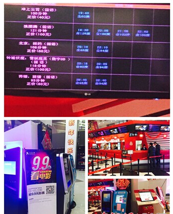 與網上如火如荼的活動相對應,諸多電影院配備了取票終端。如健德門的一家影院大廳醒目位置擺放了包括大眾點評網、時光網、貓眼網、微信電影票、賣座、百度糯米電影取票機、格瓦拉電影、網票網等多臺自助取票機,幾乎囊括了所有的在線電影票網。