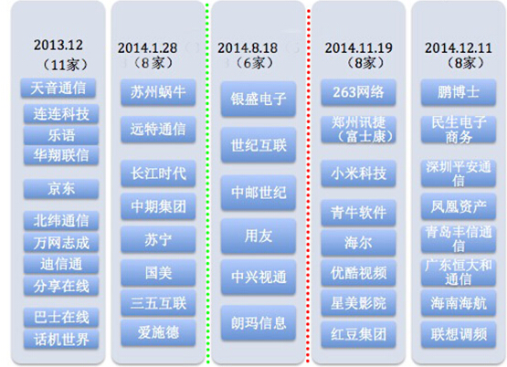 首先,是牌照發放時間的原因。從時間上看,牌照發放是陸續發放,有近20家企業是在2014年年底獲得牌照(如上圖)。獲得牌照的企業要和基礎運營商對接、測試;企業本身也要進行專業人員的組建、IT系統的開發、業務模式的探索、呼叫中心的建立。
