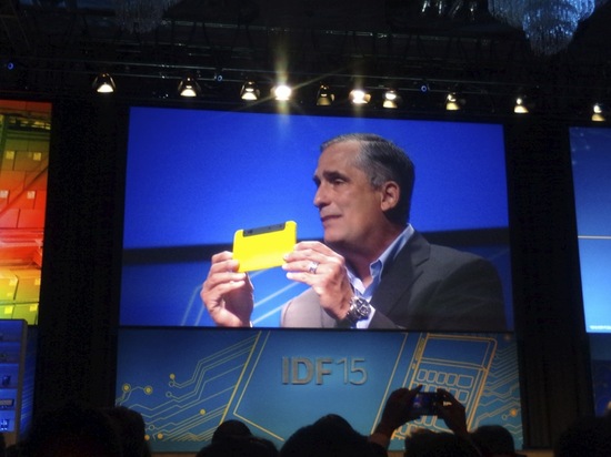 網易科技訊 4月8日消息,2015年英特爾IDF第一天,英特爾CEO科再奇做了主題演講,重點介紹了英特爾在實感技術的創新。科再奇表示實感技術不僅可以用在平板電腦、筆記本上,還可以使用在手機上。科再奇現場展示了一個安裝英特爾實感技術的手機。