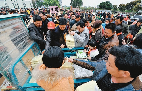 转移民众领取免费午餐。中新社