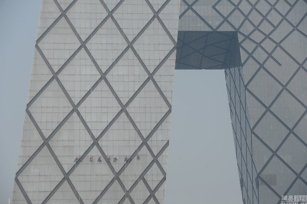 2015年4月9日消息,北京,近日有央視記者發微信說,央視新址大樓正在開始建成以來的首次外裡面清洗,清洗費用50萬元人民幣,耗時需要40天。圖為在央視大樓的外吊著繩索的工作人員。
