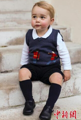 資料圖:當地時間2014年12月13日,英國倫敦,英國喬治小王子坐在肯辛頓宮庭院臺階上拍攝官方圣誕照片。