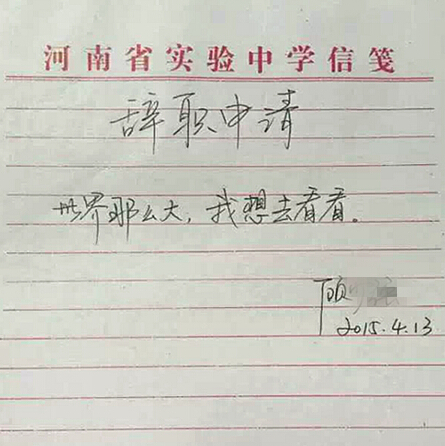 信中写到辞职的理由仅有10字:“世界那么大,我想去看看”。落款是一位顾姓人。信笺透露这位辞职者可能就职于河南省实验中学。