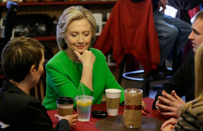 希拉莉先在一家咖啡店与民众交谈,她点了一杯印度奶茶、一杯鲜奶咖啡和柠檬水,花了6.96美元。她之後前往一家社区学院与师生交流,讨论教育政策,又提出四大执政方向,指期望成为美国人的扞卫者。