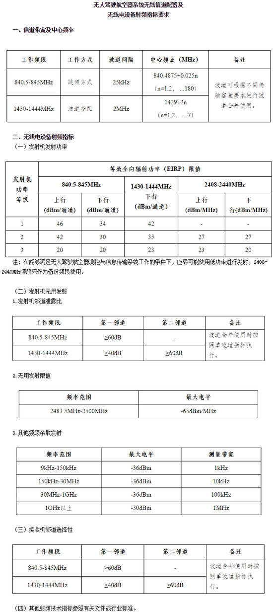 為滿足應急救災、森林防火、環境監測、科研試驗等對無人駕駛航空器系統的需求,根據《中華人民共和國無線電頻率劃分規定》及我國頻譜使用情況,規劃840.5-845MHz、1430-1444MHz和2408-2440MHz頻段用于無人駕駛航空器系統。具體事宜通知如下: