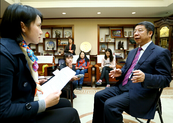 亚投行首席谈判代表会议主席、财政部副部长史耀斌(右)昨接受专访。新华社