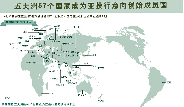 来自五大洲的57个国家成为亚投行的意向创始成员国。