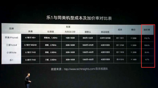從圖中可以看出,iPhone 6的成本價不過1911元(售價5288元)、三星Note 4是2160元(售價5399元)、小米Note是1910元(售價2299元),樂1的成本是1510元(售價1499元),也就是只有樂視手機是賠錢在賣。