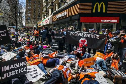 當日,人們在紐約舉行抗議,要求提高美國快餐店員工時薪。