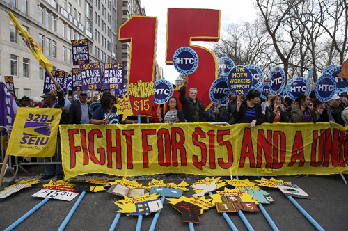 4月15日,在美國紐約,抗議者舉起標語,要求提高快餐店員工時薪。