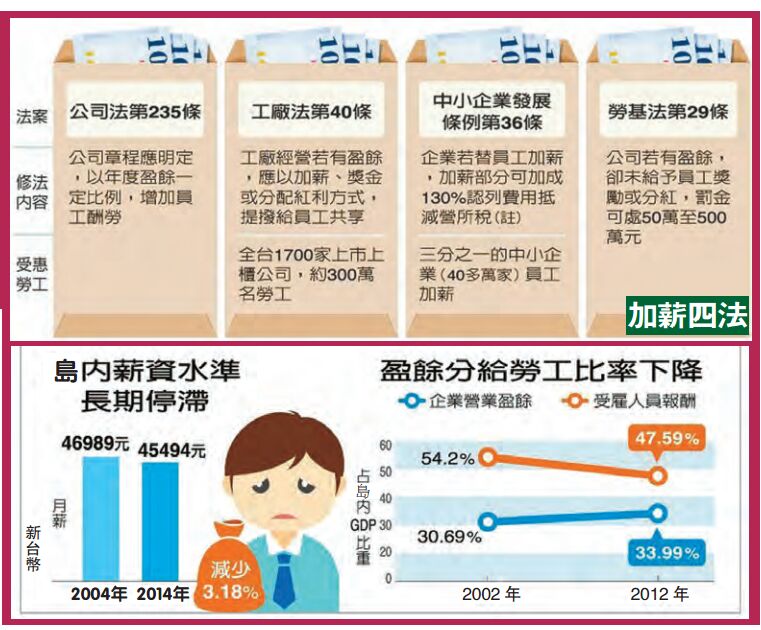 為了提高臺灣勞工薪資水平,國民黨力推「加薪四法」,其中工廠法、公司法與勞基法等三法修正案,今日可望三讀通過。勞基法中明訂分配利潤由企業與工會協商,且對未依規定執行者祭出重罰,引發企業反彈。經濟部長鄧振中昨日首度表態,不應讓勞動條件太僵硬,否則對經濟發展不好。他強調,雖然要思考如何強化對勞工保護,但也要考慮投資環境如何變得更好,兩者必須平衡。