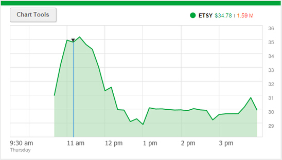 Etsy周三確定了每股16美元的IPO(首次公開招股)發行價,這一發行價處于此前公布的14至16美元的發行價區間的上線。以這一發行價計算,Etsy市值將為18億美元。在周四美國股市開盤后,Etsy股價為31美元,并在下午的交易中上漲至35美元,最終收盤價為30美元。