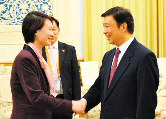 新界社团联会代表团20日访京,图为民建联主席、新社联顾问李慧琼(左)与李源潮握手