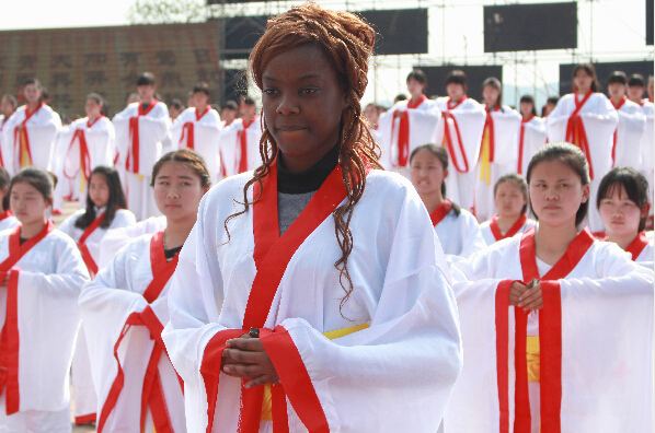 4月21日,一位外籍友人正和中国女子一起行礼。当天,湖南省洪江市举办中国·黔阳古城2015年“三月三”女儿节活动,千名14-24周岁的年轻女子,身穿传统服装,队列整齐,依照古时习俗庄严宣誓,体验成人大典。