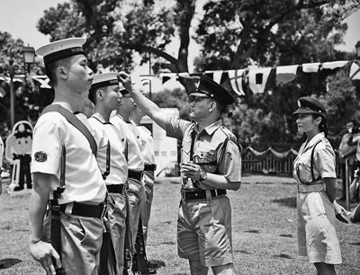 4月17日起,香港警隊170年紀念水警展覽在長洲公眾碼頭和長洲警署舉行,向公眾展示一系列水警裝備、影像資料,全面介紹香港水警的曆史。展覽期間,多艘水警輪停泊在碼頭邊上,其中一艘可供市民登船參觀,讓市民了解水警的工作情況。圖為教官在對水警隊員進行檢閱。