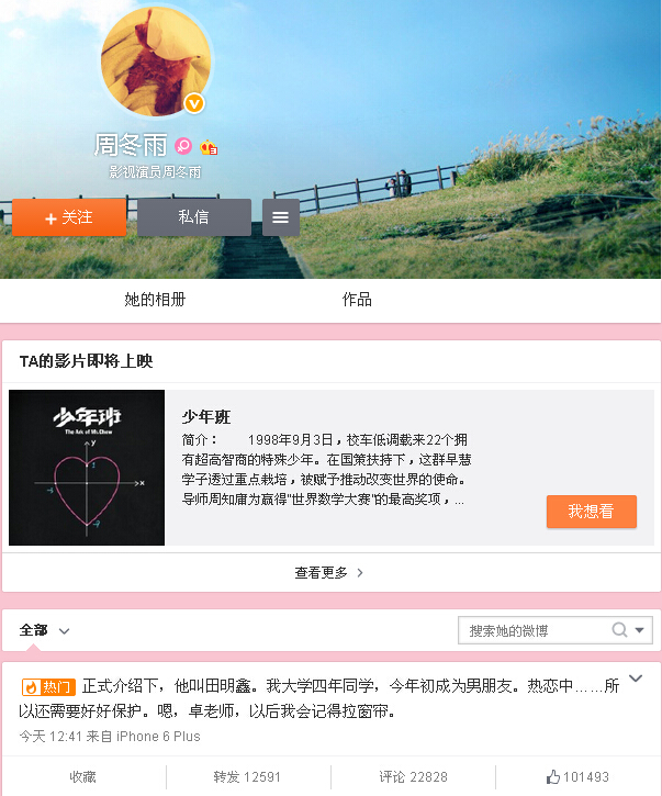 校園愛情再升級 23歲周冬雨終于戀愛了