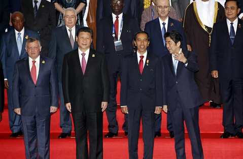 雅加達峰會的一張領導人合影顯示,印尼總統佐科-維多多(Joko Widodo)的兩側分別是習近平和安倍晉三。他們觀看印尼傳統舞蹈表演時,習近平和安倍晉三仍坐在佐科-維多多兩側。
