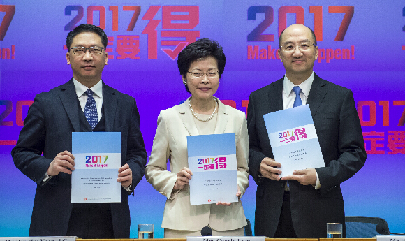 林郑月娥(中)、袁国强(左)和谭志源在新闻发布会上展示《行政长官普选办法公众谘询报告及方案》。新华社