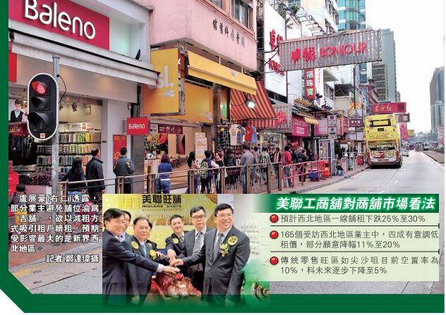 他又表示,除西北重災區外,傳統零售旺區如旺角、中環及尖沙咀等地的商舖亦受政策所波及,首當其衝是售賣貴價珠寶及鐘表等店舖。由於自由行人數減少,嚴重打擊這些店舖的銷量,加上相關店舖租金亦較其他行業高昂,在尋找新租客方面存有一定困難,且去年7至10月續租旺季又適逢碰上佔中事件,所以目前這些地區的商舖空置率相對高企,維持在約10%,但預測未來租金下跌10%至15%,空置率會逐步減少至5%。他又估計股市暢旺,市民購買慾增加,對商舖的需求相對上升。