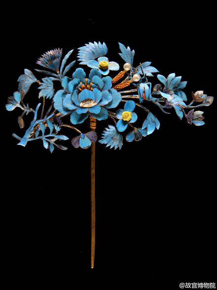 點翠是中國傳統的金銀首飾制作工藝,京劇青衣常用的頭面之一,根據所使用的翠鳥羽毛大小又分為硬翠和軟翠。點翠最早出現在漢魏時期,乾隆時代工藝水平已達頂峰。看過《甄嬛傳》的鄉親們,對“華妃娘娘”頭上的“點翠”都不會陌生,據說“華妃”頭頂中間的大鳳是當年的真品,如今市價一套點翠售價將近100萬元。