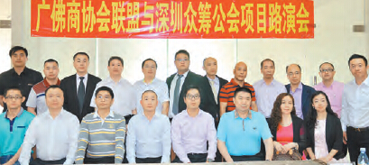 深圳眾籌公會執行會長盧順翔(前排左三)和廣佛商協會國際聯盟會長張軍(前排左四)與雙方參會人員合影留念。