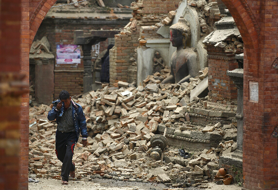 4月26日,在尼泊尔巴克塔普尔,一名男子哭泣着走过一座损毁的佛像。